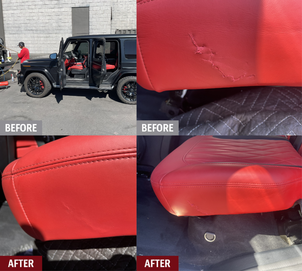 This leather repair was done on the back seat of a Mercedes Benz G Class at one of the luxury car dealerships in Scottsdale, AZ