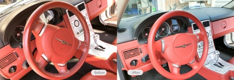 Nobody cleans leather like Fibrenew. This steering wheel had never been properly deep cleaned until we got a hold of it. Look at the difference! We are mobile and come to you in the North Raleigh, Wake Forest, and surrounding areas. (There's no re-dye here, only cleaning)