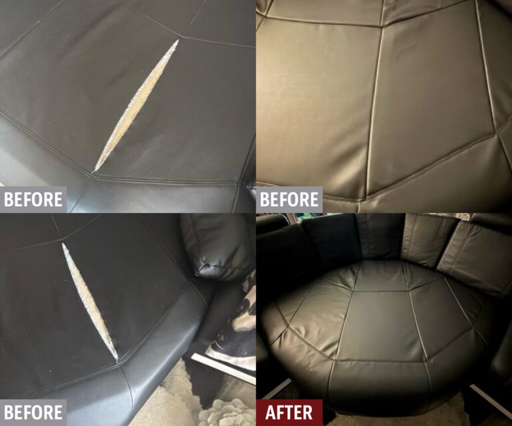 Black vinyl sofa center cushion had a rip in the center of the cushion. FibrenewNCD was tasked with mending the rip. We replaced all the vinyl with a stronger vinyl ready for anything they could jump on it.