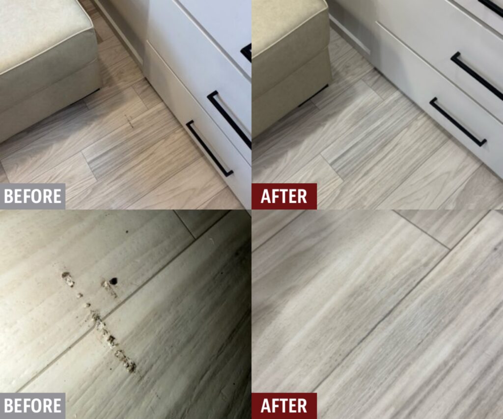 2025 Forest River SandPiper 5th wheel RV had some linoluminate floor damage from a rock getting under the living room slide-out. FibrenewNCD was asked to make the necessary repairs before the camper took ownership. We did what we could to recreate the floor grain and texture!