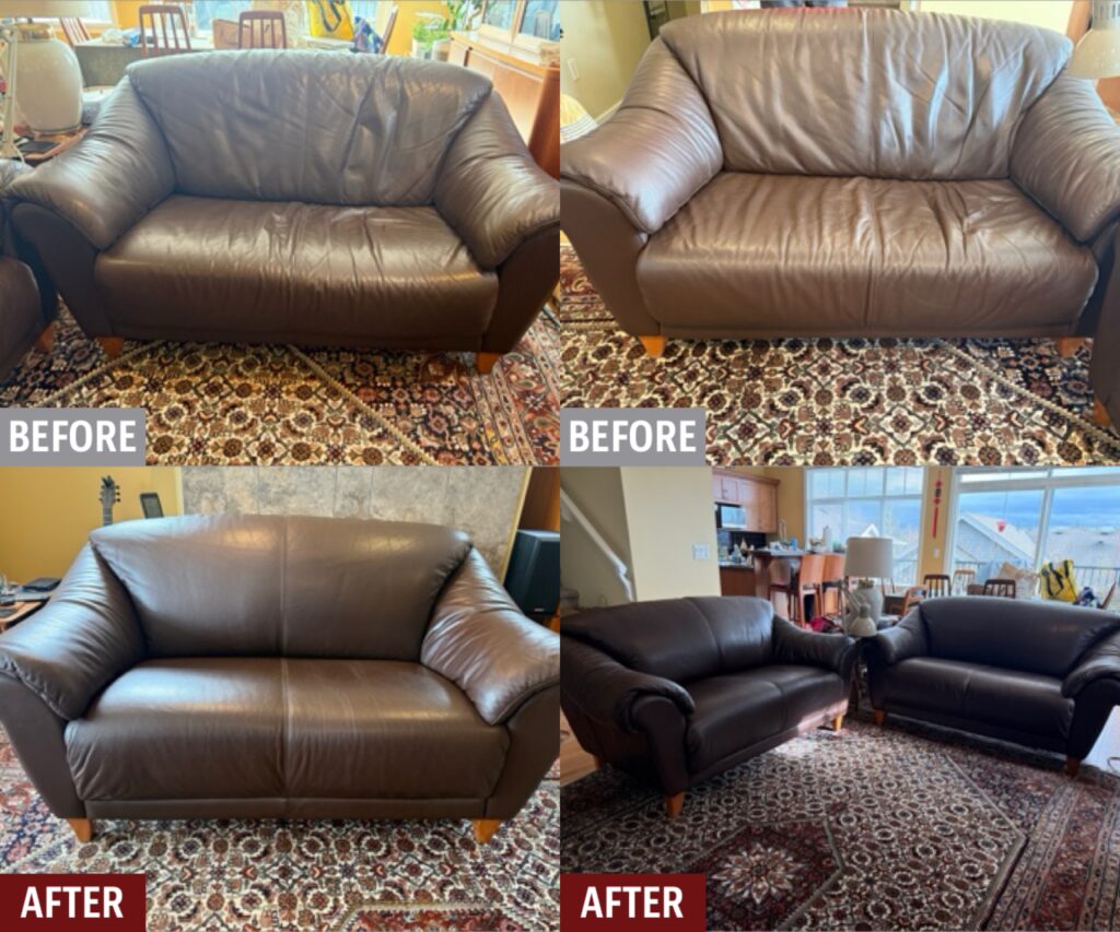 Damaged leather couches, chairs, and sofas, whether torn, worn, ripped or faded can be restored by Fibrenew. Blemishes on leather furniture such as burns, stains, holes, and cuts can also be renewed. If you’re looking to change the color of your leather furniture, turn to our expert color matching and re-dye services. We offer mobile leather furniture repair service to your home or business.