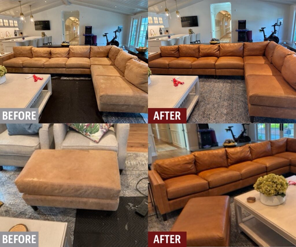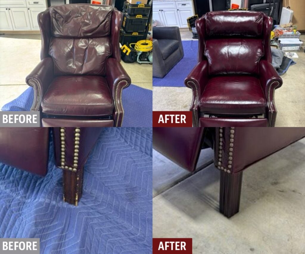 Damaged leather couches, chairs, and sofas, whether torn, worn, ripped or faded can be restored by Fibrenew. Blemishes on leather furniture such as burns, stains, holes, and cuts can also be renewed. If you’re looking to change the color of your leather furniture, turn to our expert color matching and re-dye services. We offer mobile leather furniture repair service to your home or business.